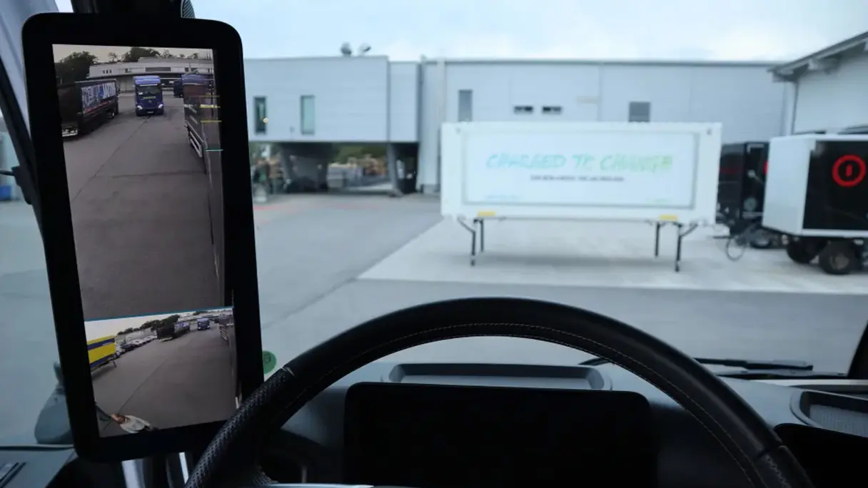 Thomas Wolff: Ein weiteres technisches Highlight des E-Actros sind die Kameras, die die herkömmlichen Außenspiegel ersetzen. Diese Neuerung sorgt nicht nur für eine bessere Übersicht, sondern trägt auch zu erheblichen Einsparungen bei. Da es sich um einen Prototyp handelt, ist die Innenausstattung des Fahrzeugs noch nicht vollständig ausgebaut, jedoch bieten die Kameras bereits jetzt einen deutlichen Vorteil gegenüber traditionellen Systemen.